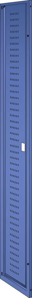 Flügeltüren (1-flügelig): Die Türen in Vollblech besitzen eine Verstärkungstasche und sind aus einem Stück gekantet. Die Flügeltüren sind einschlagend und rechts angeschlagen. Die Oberfläche ist wahlweise glatt oder mit einem Lochfeld in 8 x 8 mm zur zusätzlichen Belüftung ausgestattet. Die Türen schliessen mit dem Schrankgehäuse bündig ab und sind über einen Drehbolzen gelagert. Öffnungswinkel ca. 110 Grad, mit Aussparung für jeweiliges Schliesssystem.
