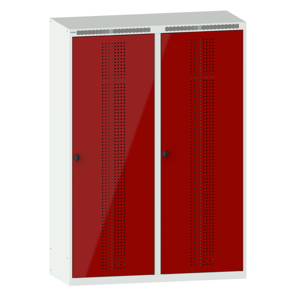 Garderobenschrank (BxTxH) 1200x500x1700mm 4 Abteile ohne Unterbau, Türen gelocht, Sicherheits-Drehknopfverschluss Lichtgrau RAL 7035 / Rubinrot RAL 3003