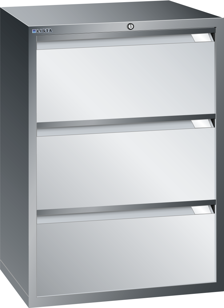 Registraturschränke: Hochwertige, verschweisste Stahlblechkonstruktion. Wahlweise einfachbreite oder doppelbreite Registraturschränke. Alle Schubladen mit Vollauszug, A4-Schubladen inklusive Ausrüstung für den Einsatz von Hängemappen, mit Einzelschubladensperre als Kippsicherung. Pro Schublade ein Etikettenhalter mit Etikett. Basisausführung der Schränke ohne Verschluss, separates Schliesssystem KEY Lock, verschiedenschliessend, oder Schliessung über Hauptschliessanlage. Farbe: gemäss Farbkarte.