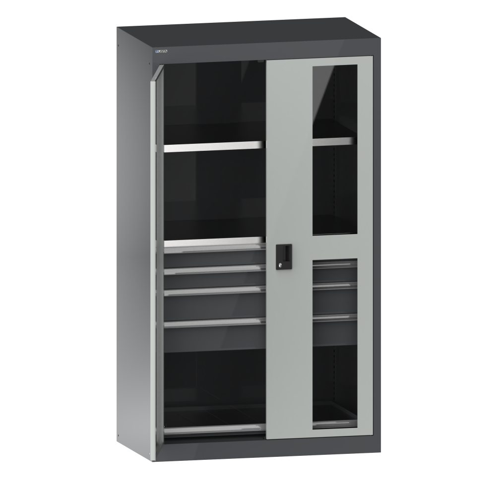 Schwerlastschränke mit Flügeltüren: Die Schränke sind ausgestattet mit: Verstellböden verzinkt, 35 mm stark, Auszugböden und Schubladen lackiert generell Grau, NCS 4502-B. Flügeltüren aus einem Stück gekantet, wahlweise aus Vollblech oder mit Sichtfenstern. Schliessungen KEY Lock, CODE Lock oder RFID Lock möglich.