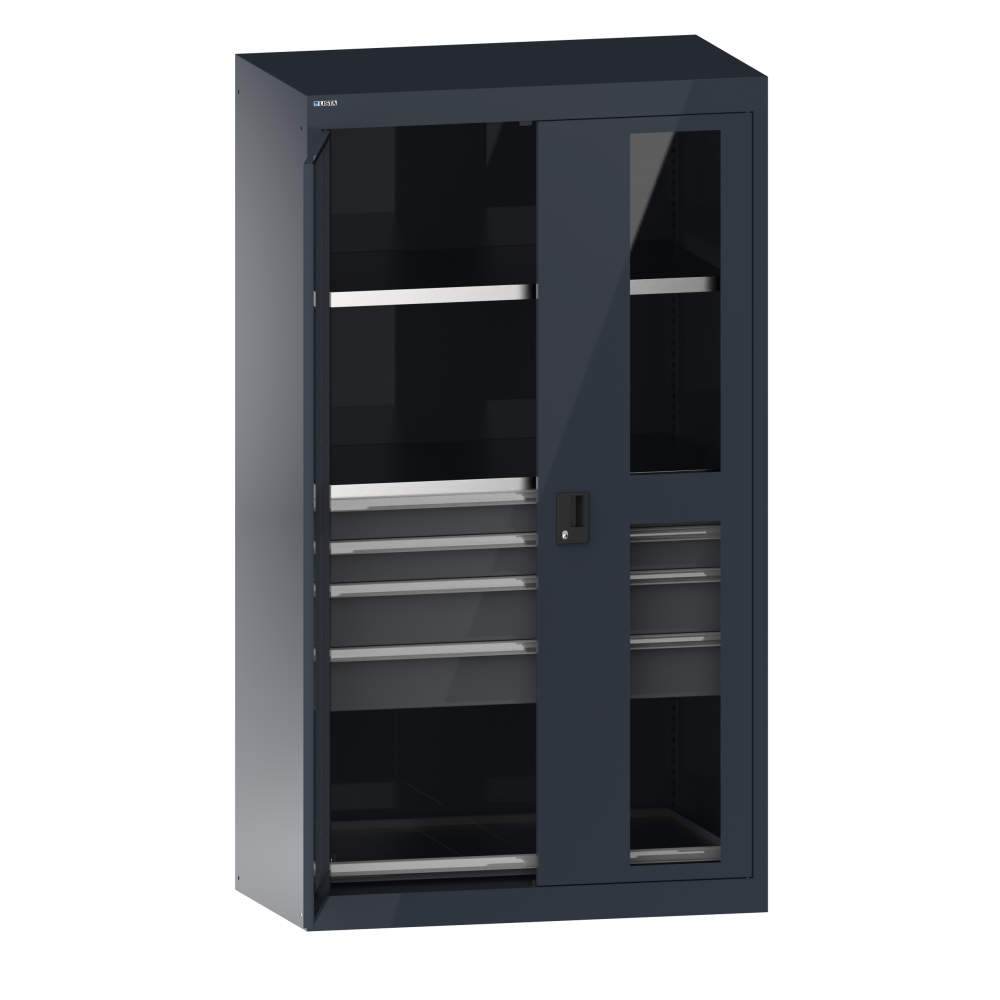 Schwerlastschränke mit Flügeltüren: Die Schränke sind ausgestattet mit: Verstellböden verzinkt, 35 mm stark, Auszugböden und Schubladen lackiert generell Grau, NCS 4502-B. Flügeltüren aus einem Stück gekantet, wahlweise aus Vollblech oder mit Sichtfenstern. Schliessungen KEY Lock, CODE Lock oder RFID Lock möglich.