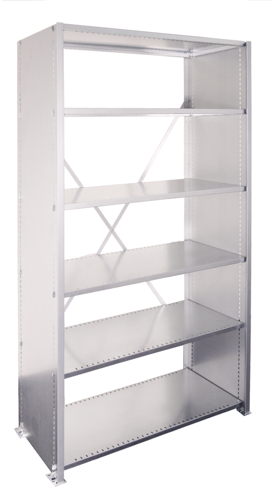 Vollblech-Seitenwand, Max. Feldlast 1000 kg: Standard mit Dreieck-Abkantung vorne. Schlitzteilung 25 mm, zum Einhängen der Bodenträger. Inklusive Fussplatten-Set, verzinkt. Ausführung: Stahlblech. Farbe: gemäss Farbkarte oder verzinkt.