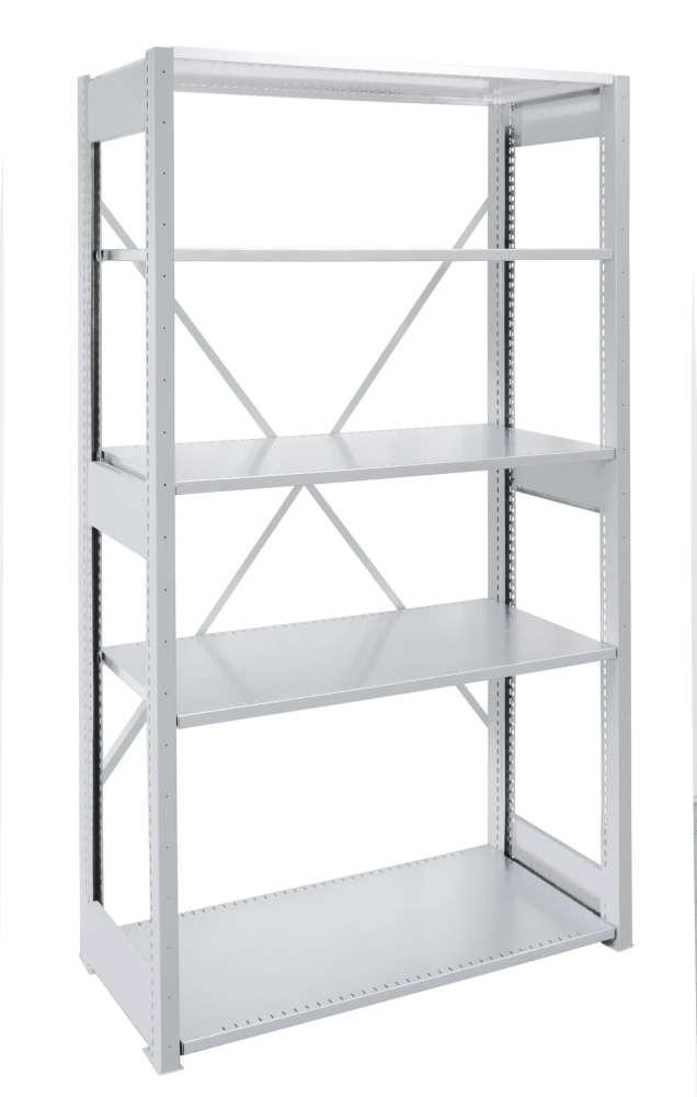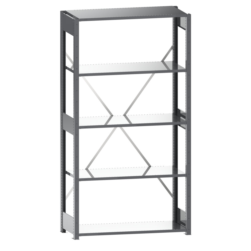 2 Regalstützenpaare inkl. 6 Tiefenstreben, 1 Diagonalkreuz verzinkt, Fachböden geschlitzt (Stärke 25 mm)