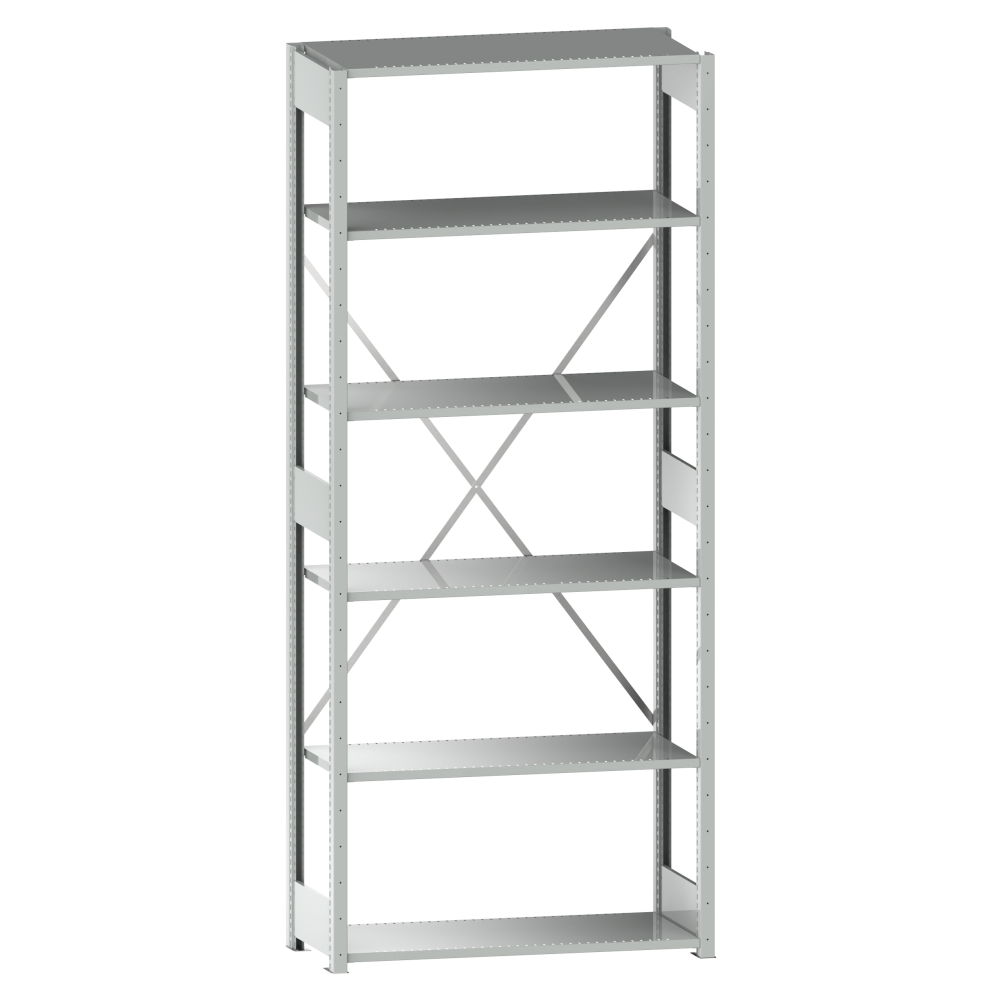2 Regalstützenpaare inkl. 6 Tiefenstreben, 1 Diagonalkreuz verzinkt, Fachböden geschlitzt (Stärke 25 mm)