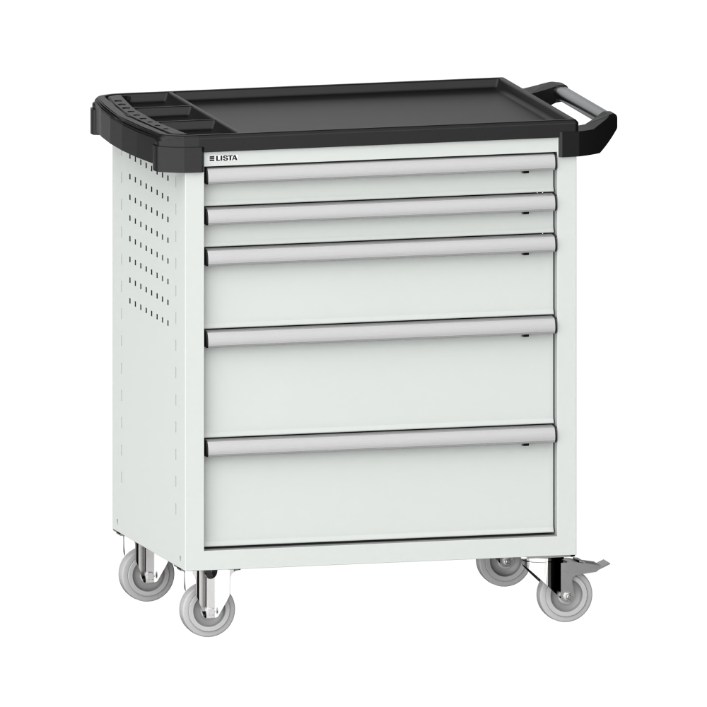 Werkstattwagen 36x27E (BxTxH) 894x525x928mm 5 Schubladen (2x75/1x150/2x200) 40kg mit Kunststoffabdeckung Einzelsicherung rechts KEY Lock Hellgrau NCS S 2000-N