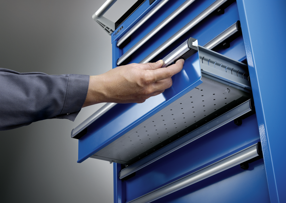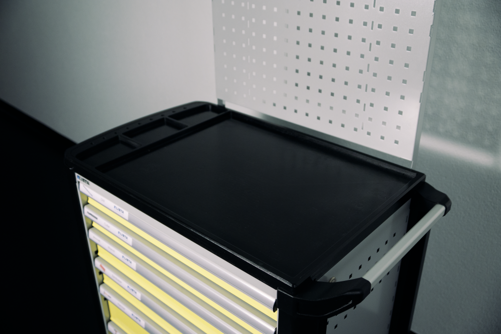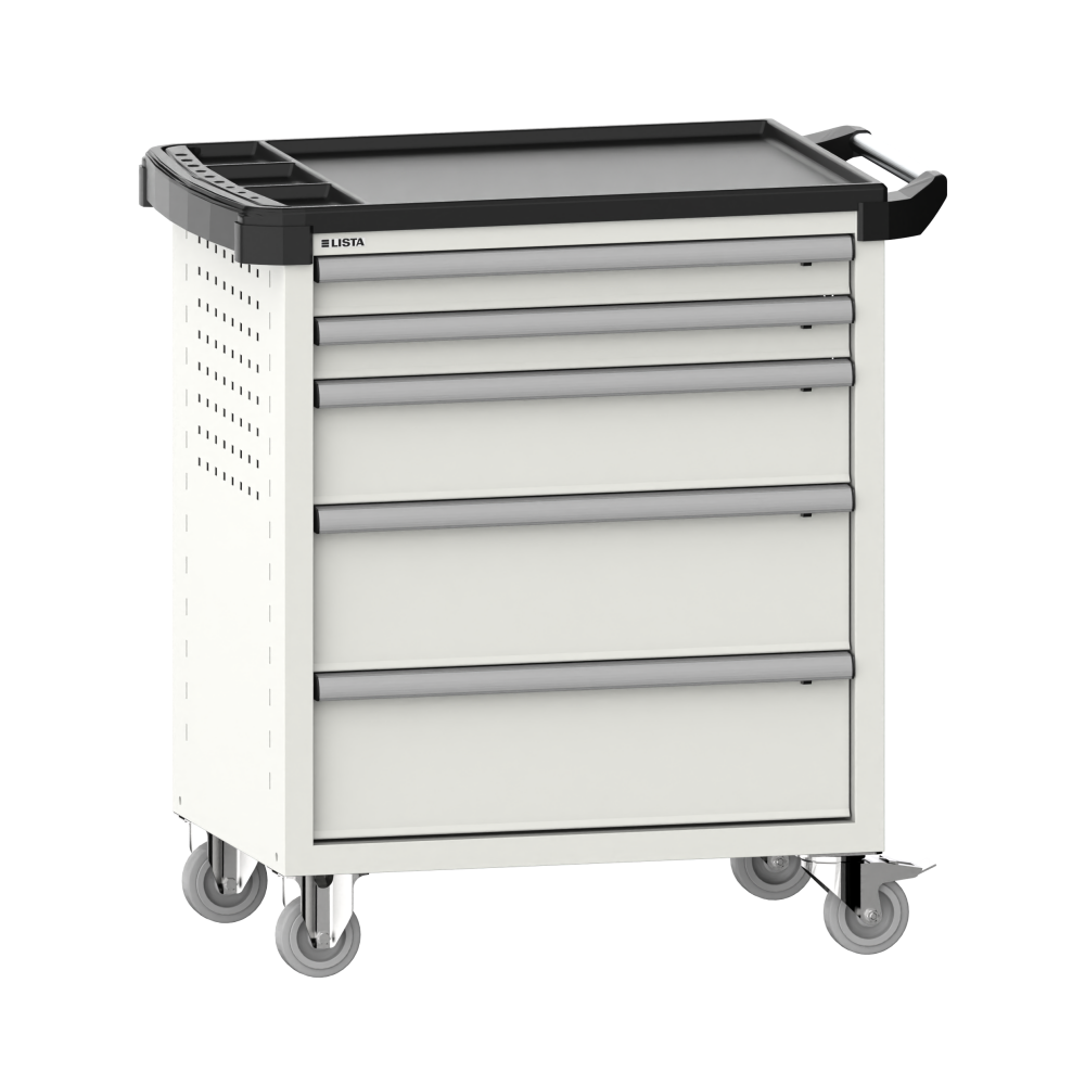 Werkstattwagen 36x27E (BxTxH) 894x525x928mm 5 Schubladen (2x75/1x150/2x200) 40kg mit Kunststoffabdeckung Einzelsicherung rechts KEY Lock Reinweiss RAL 9010