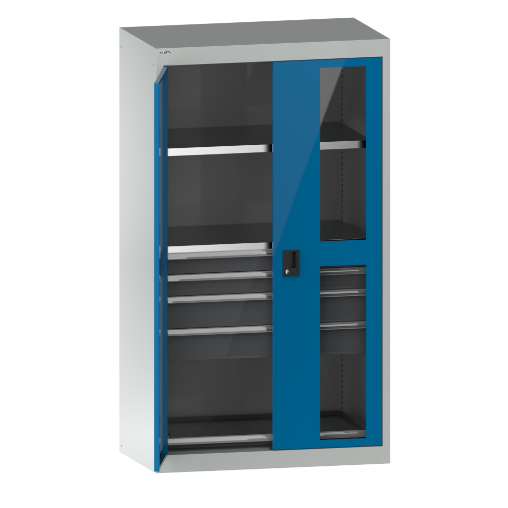Doors with viewing window: The UV-resistant acrylic glass is break-proof and enables improved workstation organisation.