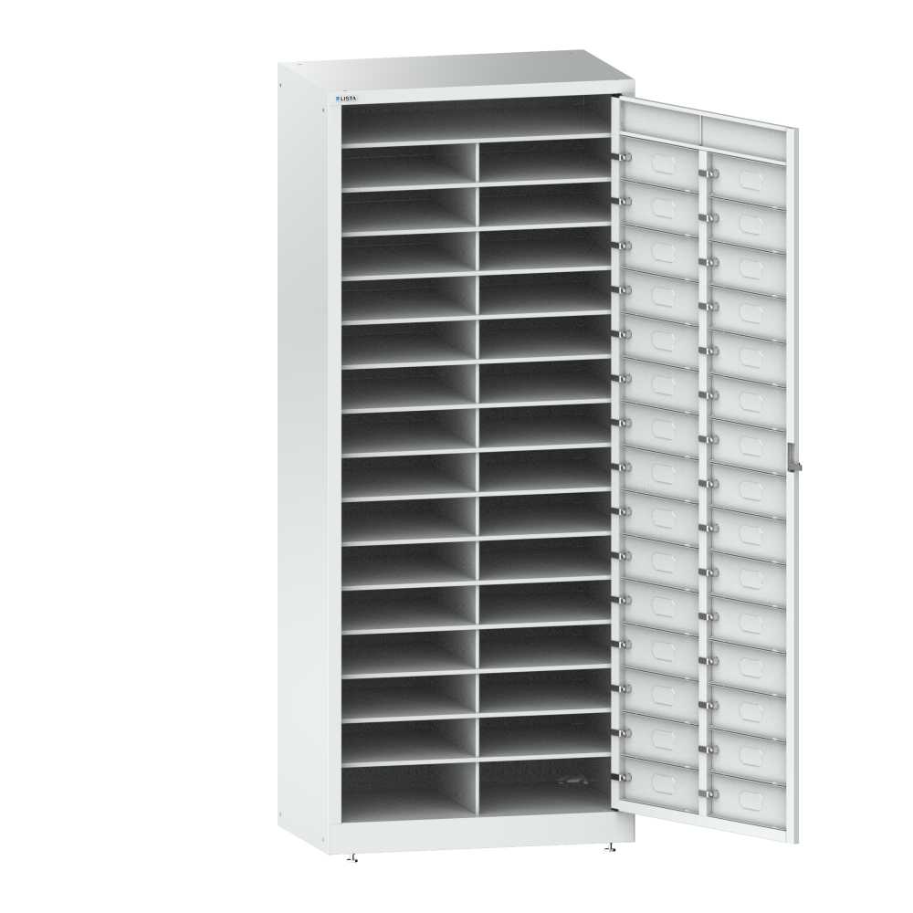 Linen cabinet (WxDxH) 802x500x1950mm 2x15 compartments incl. 4 adjustable feet and storage compartment on top KEY Lock Pale grey NCS S 2000-N
