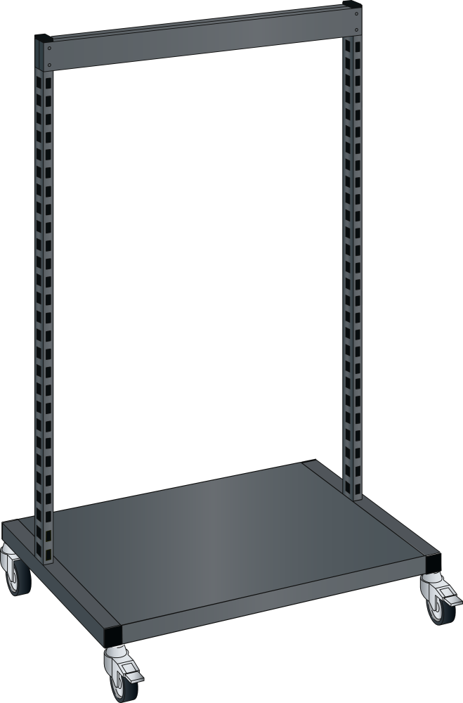 Mobile side frame: The assembly trolleys can have elements attached on both sides. The support pillars enable rear panels, adjustable shelves or container strips to be mounted without the use of screws. The assembly trolleys are equipped with 4 swivel castors, 2 of which have braking mechanisms. Wheel diameter 100 mm, rubber, grey, max. capacity 250 kg. Specification: side frame comprising crossbars, shelves and support pillars, made of steel profile, perforated on four sides at 50 mm increments. Colour: according to colour chart. Roller housing made of galvanised and chrome-plated sheet steel.