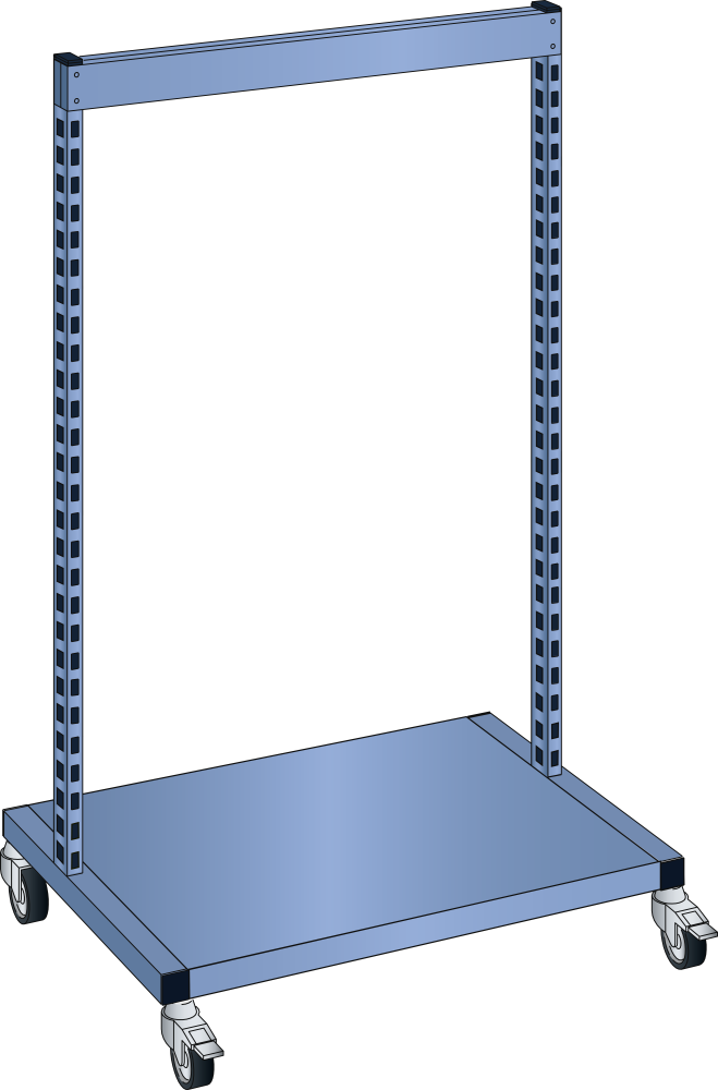 Mobile side frame: The assembly trolleys can have elements attached on both sides. The support pillars enable rear panels, adjustable shelves or container strips to be mounted without the use of screws. The assembly trolleys are equipped with 4 swivel castors, 2 of which have braking mechanisms. Wheel diameter 100 mm, rubber, grey, max. capacity 250 kg. Specification: side frame comprising crossbars, shelves and support pillars, made of steel profile, perforated on four sides at 50 mm increments. Colour: according to colour chart. Roller housing made of galvanised and chrome-plated sheet steel.