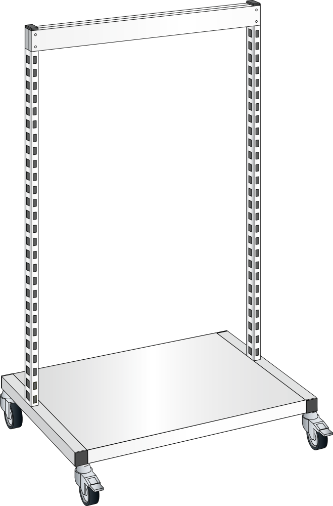 Mobile side frame: The assembly trolleys can have elements attached on both sides. The support pillars enable rear panels, adjustable shelves or container strips to be mounted without the use of screws. The assembly trolleys are equipped with 4 swivel castors, 2 of which have braking mechanisms. Wheel diameter 100 mm, rubber, grey, max. capacity 250 kg. Specification: side frame comprising crossbars, shelves and support pillars, made of steel profile, perforated on four sides at 50 mm increments. Colour: according to colour chart. Roller housing made of galvanised and chrome-plated sheet steel.