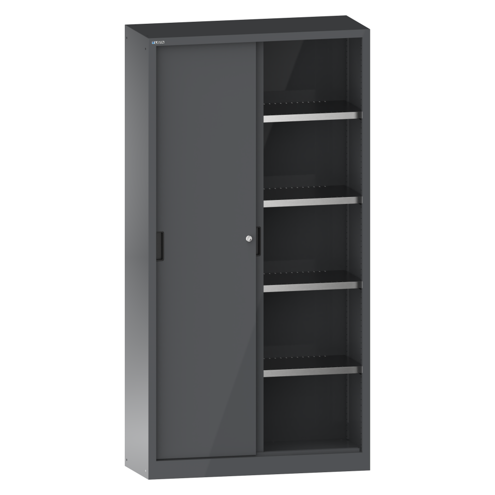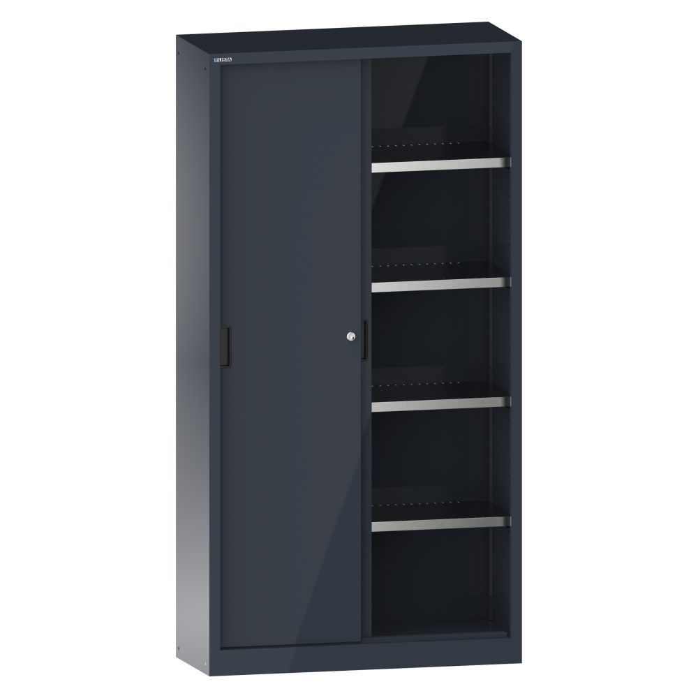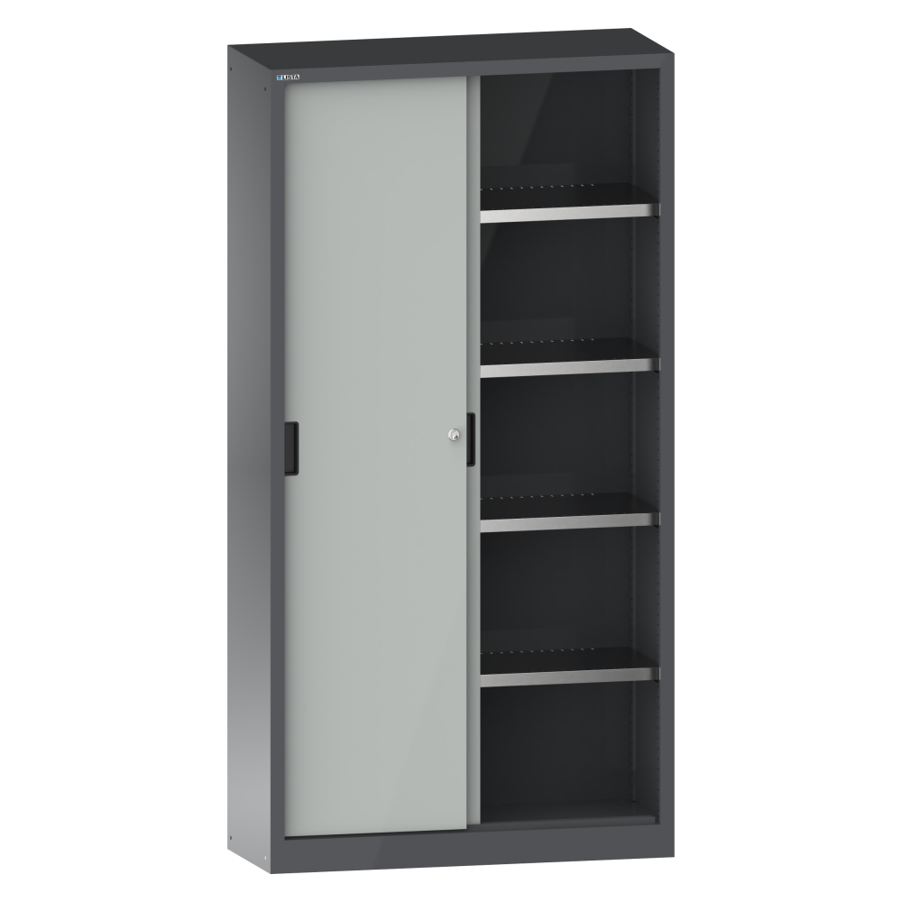 Sliding-door cabinets: Depending on the model, the cabinets are equipped with: galvanised adjustable shelves, 30 mm thick, load capacity 60 kg. Pull-out shelves and drawers painted, anthracite grey, RAL 7016, load capacity 50 kg