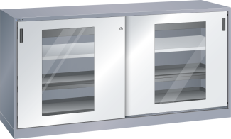 Sliding-door cabinets: Depending on the model, the cabinets are equipped with: galvanised adjustable shelves, 30 mm thick, load capacity 60 kg. Pull-out shelves and drawers painted, anthracite grey, RAL 7016, load capacity 50 kg