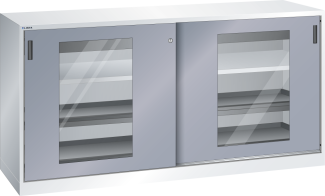 Sliding-door cabinet with 2 viewing window doors and partition (WxDxH) 2000x580x1000mm 2 shelves, 2 drawers, 4 pull-out shelves KEY Lock Light grey RAL 7035 / Grey metallic NCS S 6502-B