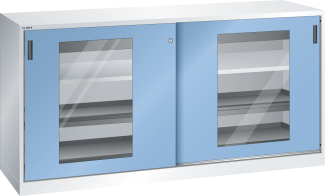 Sliding-door cabinet with 2 viewing window doors and partition (WxDxH) 2000x580x1000mm 2 shelves, 2 drawers, 4 pull-out shelves KEY Lock Light grey RAL 7035 / Light blue RAL 5012