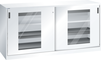 Sliding-door cabinets: Depending on the model, the cabinets are equipped with: galvanised adjustable shelves, 30 mm thick, load capacity 60 kg. Pull-out shelves and drawers painted, anthracite grey, RAL 7016, load capacity 50 kg