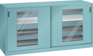Sliding-door cabinet with 2 viewing window doors and partition (WxDxH) 2000x580x1000mm 2 shelves, 2 drawers, 4 pull-out shelves KEY Lock Turquoise blue RAL 5018