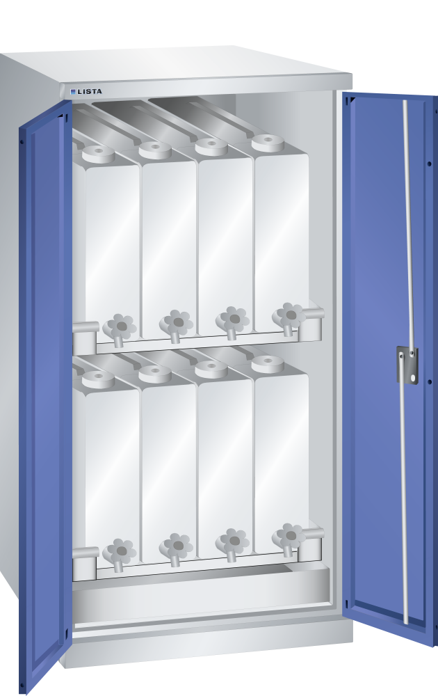 Armarios para fluidos. Los armarios están equipados con: cubetas de retención de acero al cromo, 2 mm de grosor, soldadas herméticamente de acuerdo con el artículo 19 de la Ley alemana sobre el régimen de aguas (WHG) / Directiva sobre los requisitos de los contenedores de recogida fabricados en acero (StawaR), capacidad de 40 litros, suelos colectores lacados en gris, NCS 4502-B, bidones de plástico polietileno de alta densidad con grifo cromado. Puertas batientes de chapa maciza con remate de una pieza, con pivotes y ángulo de abertura de 235 grados.