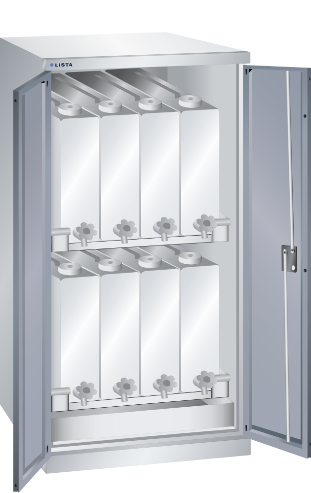 Armarios para fluidos. Los armarios están equipados con: cubetas de retención de acero al cromo, 2 mm de grosor, soldadas herméticamente de acuerdo con el artículo 19 de la Ley alemana sobre el régimen de aguas (WHG) / Directiva sobre los requisitos de los contenedores de recogida fabricados en acero (StawaR), capacidad de 40 litros, suelos colectores lacados en gris, NCS 4502-B, bidones de plástico polietileno de alta densidad con grifo cromado. Puertas batientes de chapa maciza con remate de una pieza, con pivotes y ángulo de abertura de 235 grados.