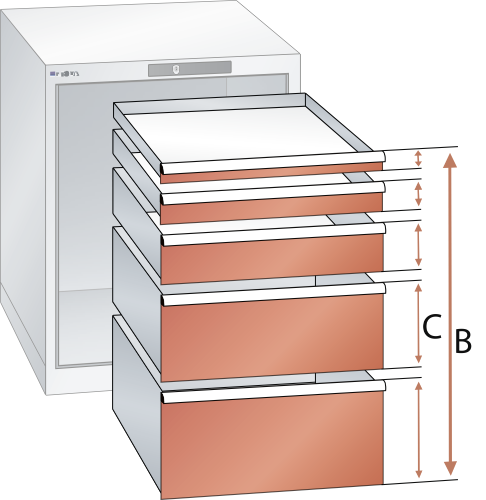 Al seleccionar los cajones es determinante la altura útil del bastidor de armario. La suma de las alturas frontales (C) debe coincidir con la altura útil (B) (véase el gráfico).