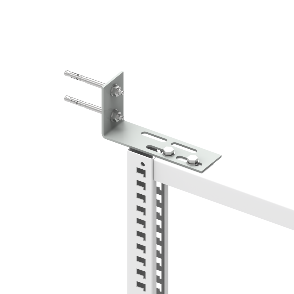 Fijación a la pared: Para atornillar los soportes de la estantería a la pared. Equipamiento: 2 pernos de acero M10x90, 1 ángulo de pared, rango de ajuste 0-55 (2 tornillos) 56-115 mm (1 tornillo), incl. material de fijación. Fabricado en chapa de acero. Color: gris claro RAL 7035.