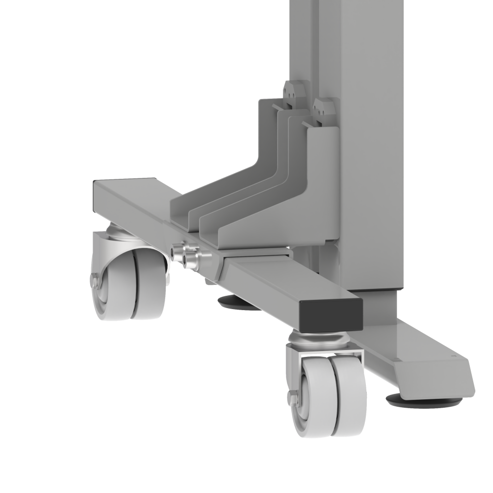 El juego de ruedas se fija directamente en el pie del puesto de trabajo Duo y sirve exclusivamente para necesidades móviles temporales en estado sin carga. Al elevar el pie, las ruedas se «retraen» y garantizan así una posición más segura de la mesa Duo.