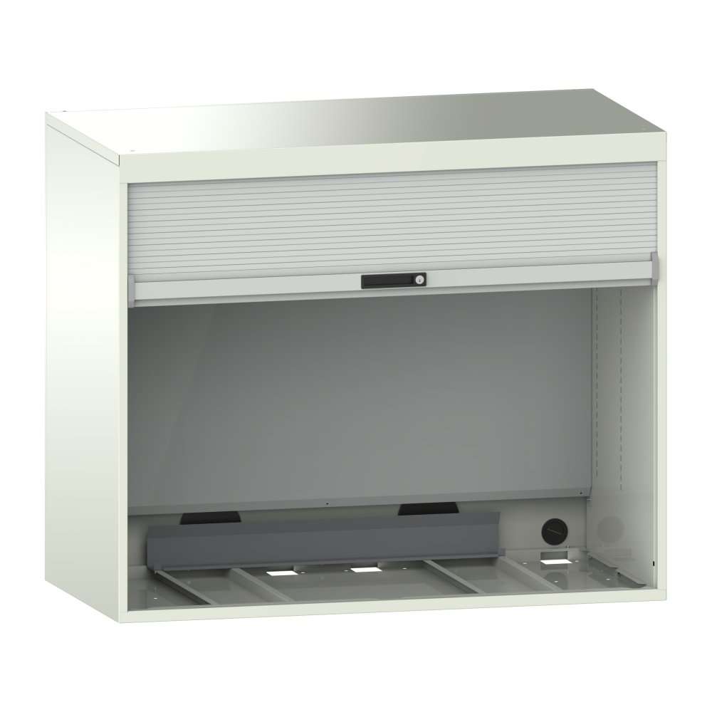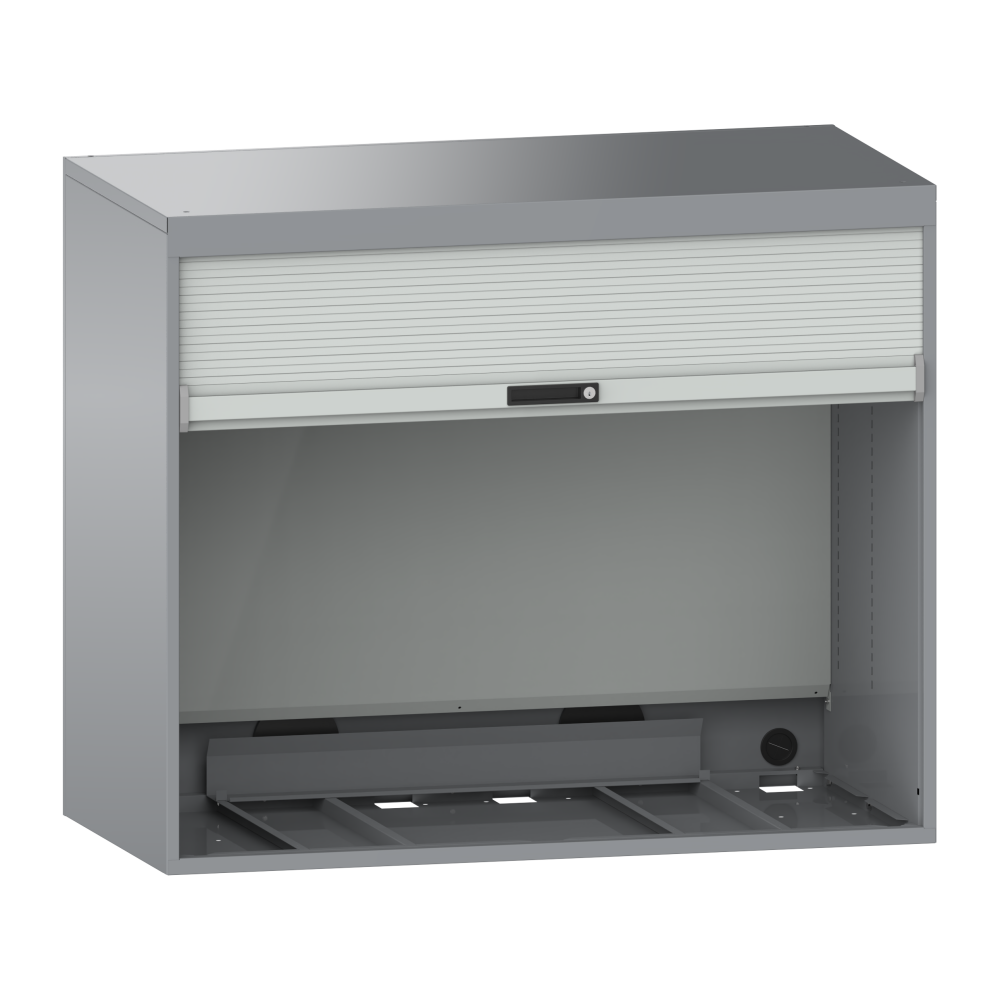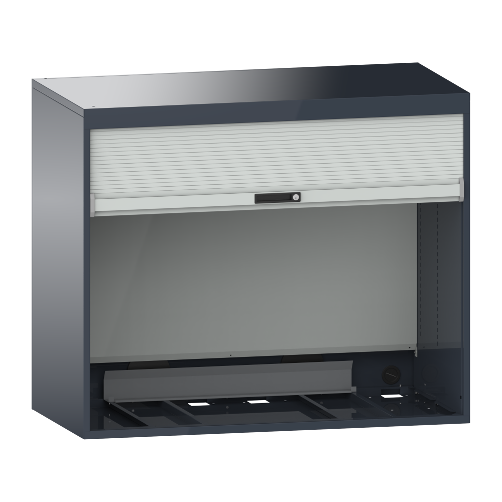 Armoire Quality : le bâti d'armoire à paroi double est équipé d'un rideau en plastique intégré verrouillable et de parois latérales à fentes pour poser les rayons amovibles. Une paroi arrière encastrée protège le guide-câble. Des passe-câbles protégés par des douilles en caoutchouc sont prévus dans le fond du bâti et dans la paroi arrière. Matériau : tôle d'acier. Couleur : extérieur et intérieur des parois latérales selon le nuancier de couleurs ; rideau, paroi arrière et couvercle intérieur gris clair, RAL 7035. A commander séparément: avec l'électrification, la paroi arrière comprend dans sa partie inférieure 4 ou 5 prises (230V) ainsi qu'un interrupteur à bascule pour la lampe montée dans le couvercle du bâti.