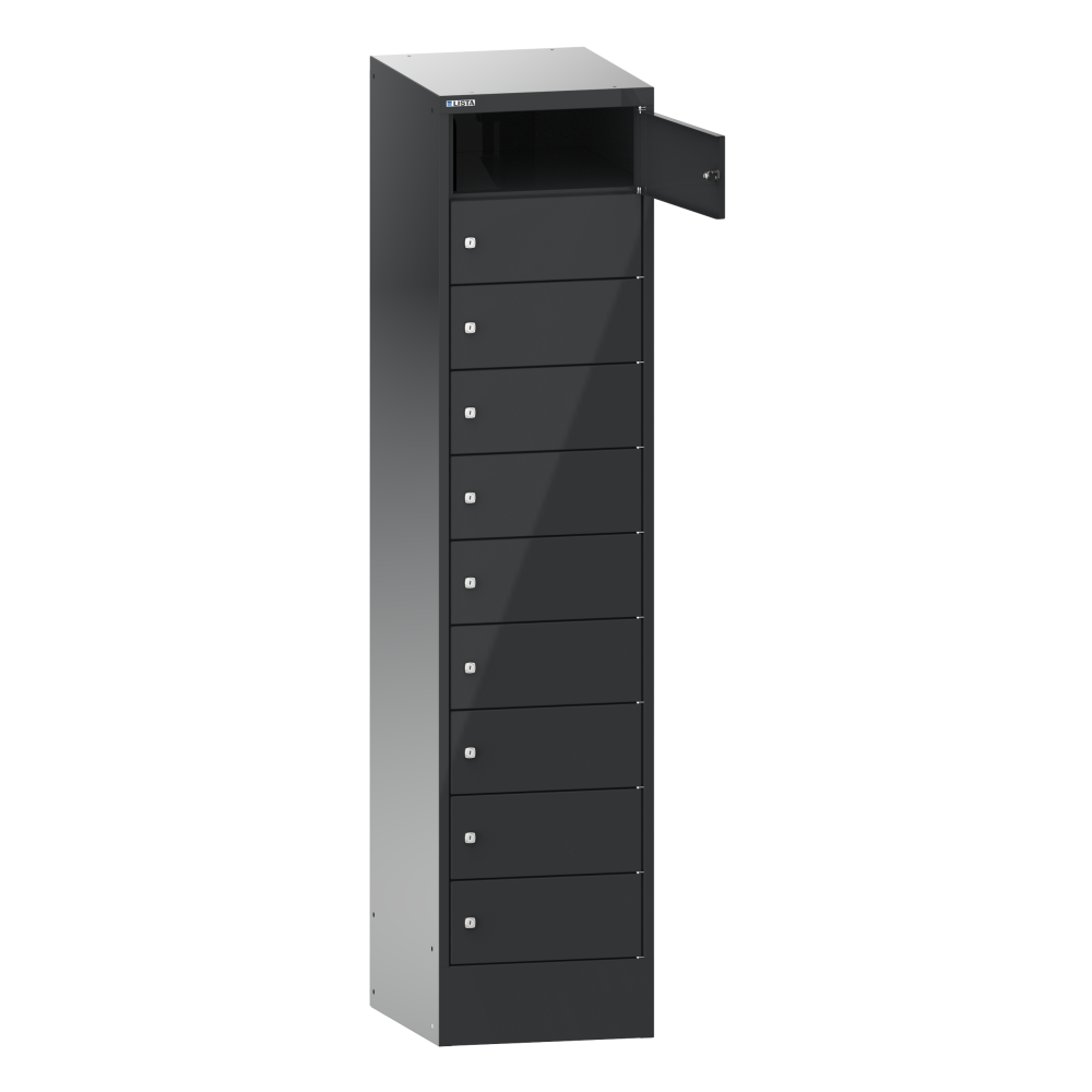 Armadi per laptop: porte in lamiera piena per una maggiore stabilità e protezione antieffrazione, ripiegate su tutti i lati, porte a battente incernierate a destra. Bordo d'urto rivestito con profilo in gomma fonoassorbente. Angolo di apertura di circa 110 gradi. Sistema di chiusura passepartout: KEY Lock è predisposto di serie per l'utilizzo come sistema di chiusura passepartout, cioè con una cosiddetta chiave passepartout tutti i vani possono essere aperti nonostante la diversa chiusura.