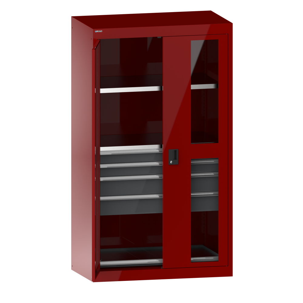 Armadi per merci pesanti con porte battenti: gli armadi sono dotati di: ripiani spostabili zincati, 35 mm spessore, ripiani estraibili e cassetti verniciati solitamente in grigio, NCS 4502-B. Porte battenti smussate su una parte, a scelta in lamiera piena oppure con riquadri trasparenti. Possibili chiusure KEY Lock, CODE Lock o RFID Lock.